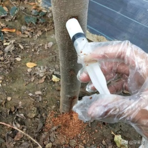 ⑦虫道内注药防治。找到新鲜排粪孔后,使用注射器从该孔上方的排粪孔向内注入80%敌敌畏乳油100倍液,也可用灭幼脲和毒死蜱熏杀幼虫。
