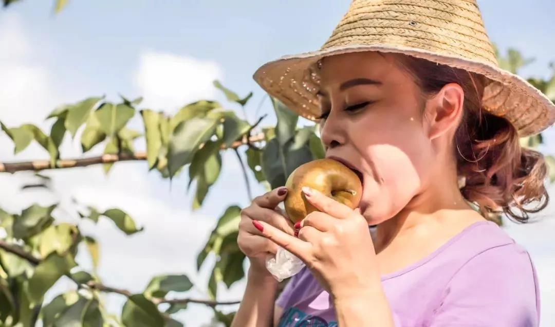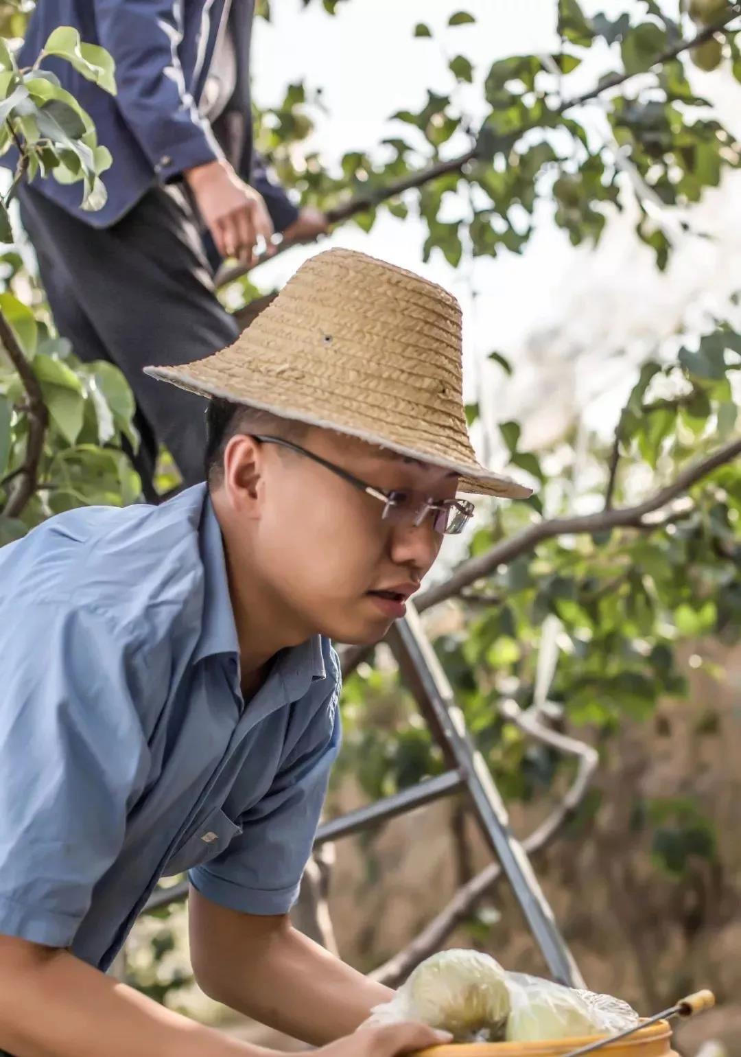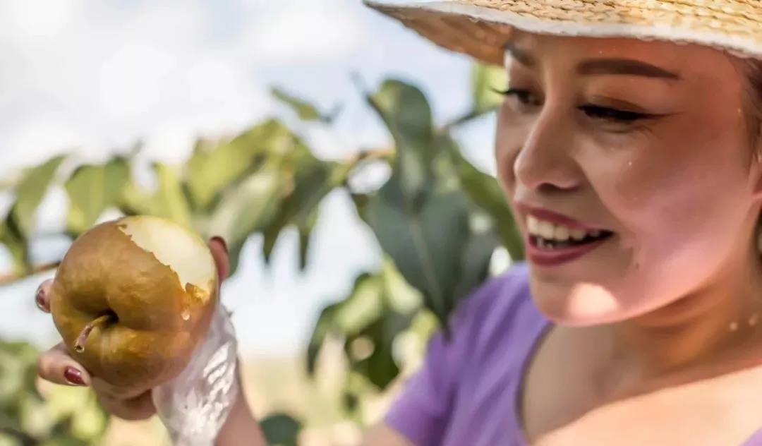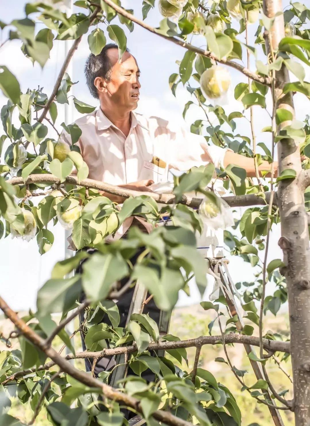 玉露香梨从结果之初,就用塑料袋将果实包裹起来,不光是为防止害虫、鸟类啃食,也是为防农药空气污染,当地人或到访游客都是直接从树上摘下就吃。